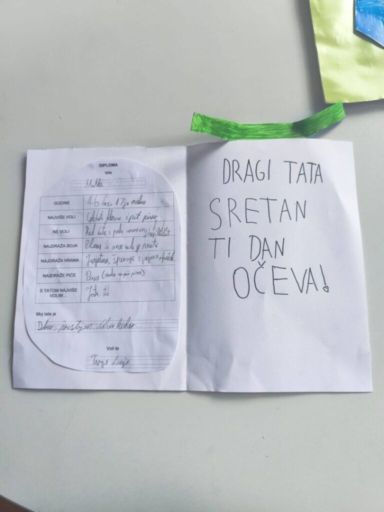 Učenici 1. i 3. razreda, zajedno sa svojim roditeljima, sudjelovali su u posebnoj radionici izrade čestitki za tate. Kroz riječi i crteže opisivali su kakvi su njihovi očevi – hrabri, brižni, zabavni i uvijek tu kada treba.