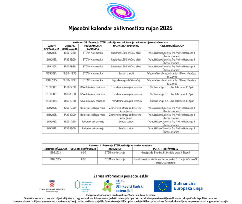 U prilogu možete pogledati drugu izmjenu mjesečnog kalendara aktivnosti za rujan 2025. godine u sklopu ESF+ projekta „STEM Learning Network“ (SF.2.4.06.04.0081) ukupne vrijednosti od 297.557,55 eura, od čega bespovratna sredstva iznose 295.480,70 eura, a iznos EU sufinanciranja 251.158,59 eura. Provedba projekta će trajati u razdoblju od 20. ožujka 2025. do 20. ožujka 2027. godine.