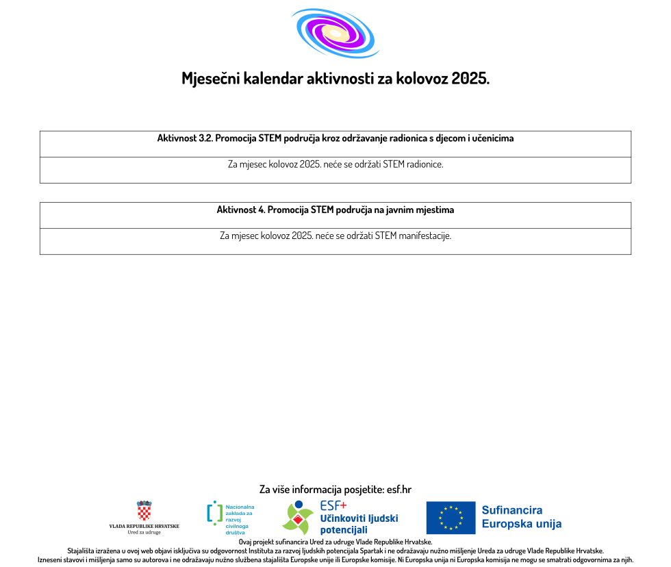 U prilogu možete pogledati Mjesečni kalendar aktivnosti za kolovoz 2025. godine u sklopu ESF+ projekta „STEM Learning Network“ (SF.2.4.06.04.0081) ukupne vrijednosti od 297.557,55 eura, od čega bespovratna sredstva iznose 295.480,70 eura, a iznos EU sufinanciranja 251.158,59 eura. Provedba projekta će trajati u razdoblju od 20. ožujka 2025. do 20. ožujka 2027. godine.