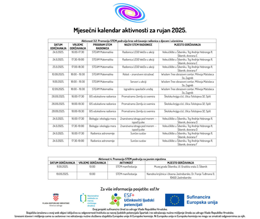 U prilogu možete pogledati Mjesečni kalendar aktivnosti za rujan 2025. godine u sklopu ESF+ projekta „STEM Learning Network“ (SF.2.4.06.04.0081) ukupne vrijednosti od 297.557,55 eura, od čega bespovratna sredstva iznose 295.480,70 eura, a iznos EU sufinanciranja 251.158,59 eura. Provedba projekta će trajati u razdoblju od 20. ožujka 2025. do 20. ožujka 2027. godine.