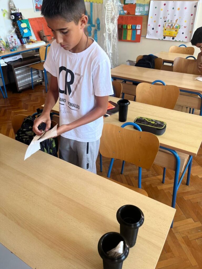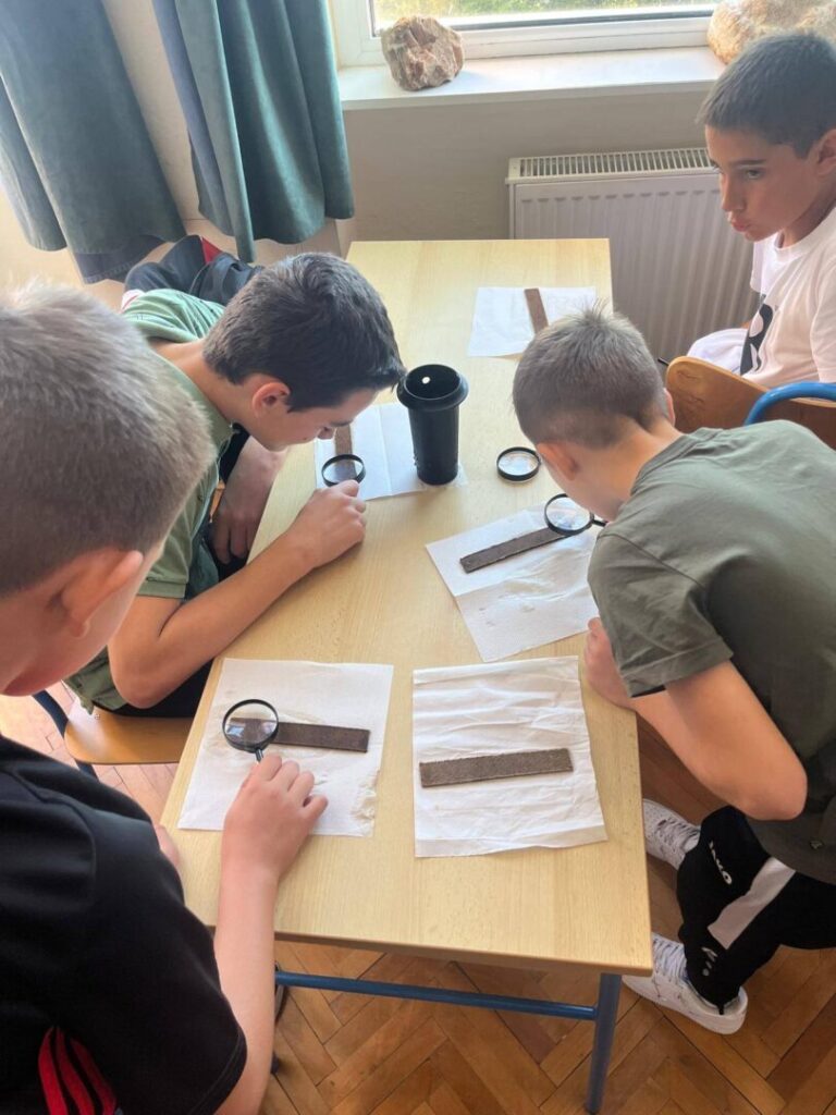 Tjedan dana ranije postavili smo posude s vodom u koje su uronili pločice lesonita. Na njih su komarci položili jajašca – a naši su znatiželjni učenici jedva dočekali praktični dio rada!